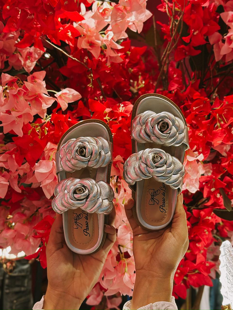 A Papete Garden Shine é para quem busca um calçado que una conforto e estilo de forma excepcional. Com um design de duas tiras frontais, este modelo metálico brilha intensamente e apresenta aplicações florais tridimensionais que transformam a simplicidade de uma papete em uma peça de destaque. É a escolha ideal para momentos que pedem conforto e um toque de luxo.