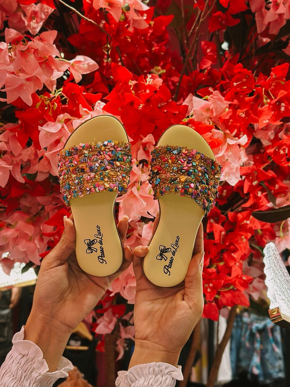 Design Exclusivo: Tira frontal rica em detalhes com pedrarias multicoloridas que refletem a luz a cada passo.