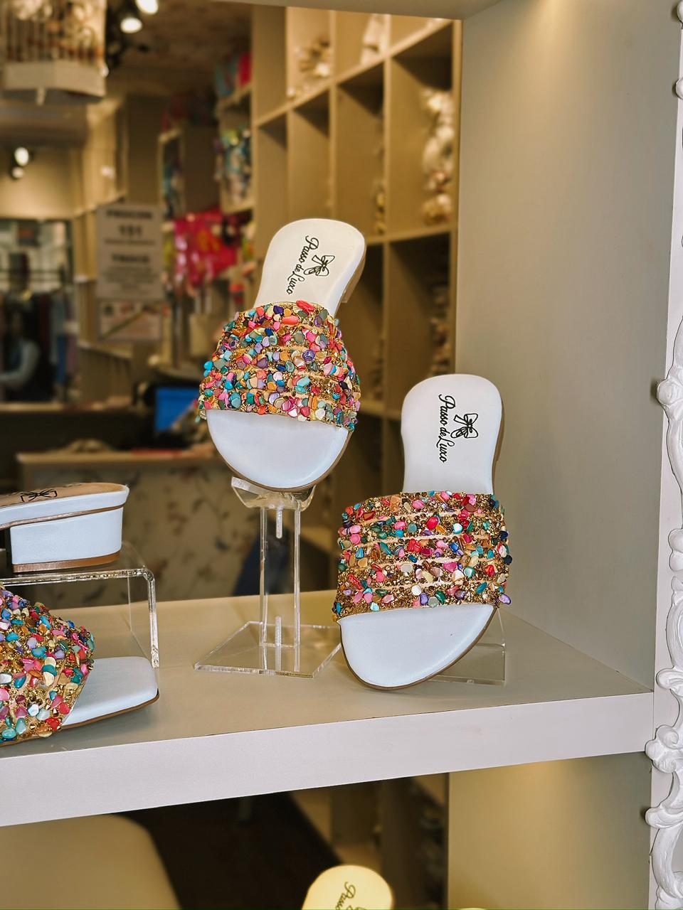 Design Exclusivo: Tira frontal rica em detalhes com pedrarias multicoloridas que refletem a luz a cada passo.
